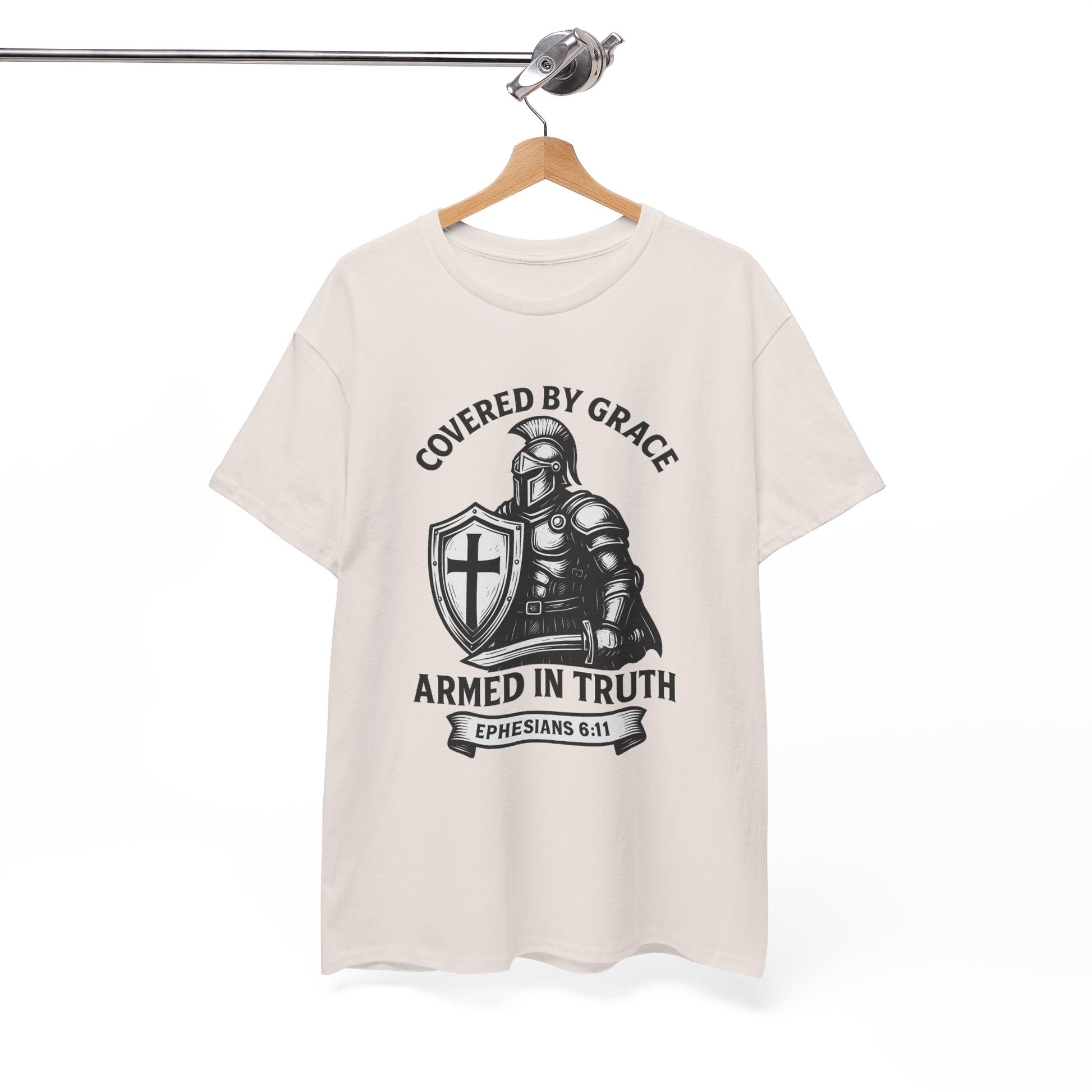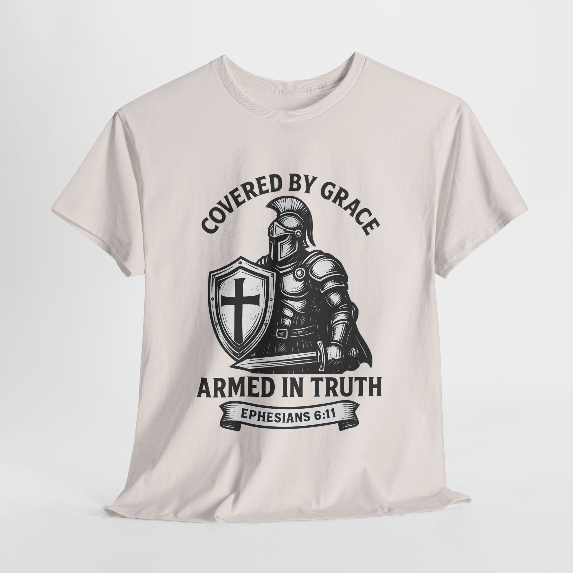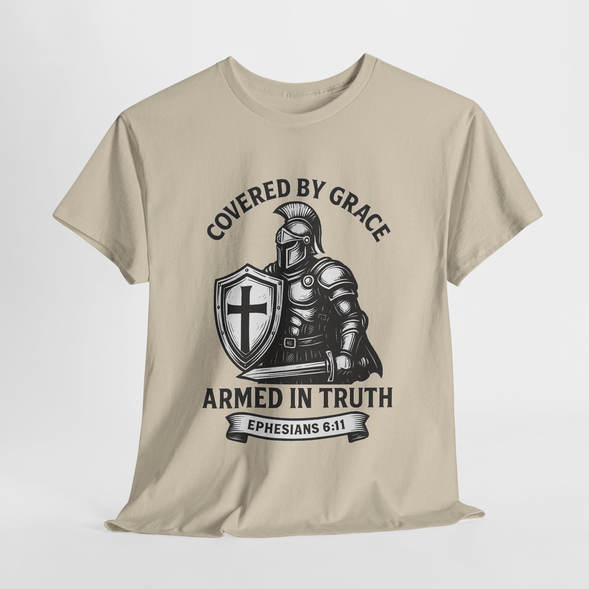 Stand firm in faith with our Covered by Grace Christian Tee — a bold, unisex shirt inspired by Ephesians 6:11. Featuring a powerful warrior design, this tee blends comfort, strength, and spiritual style. Perfect for believers who want to wear their faith proudly at church, gatherings, or everyday life.