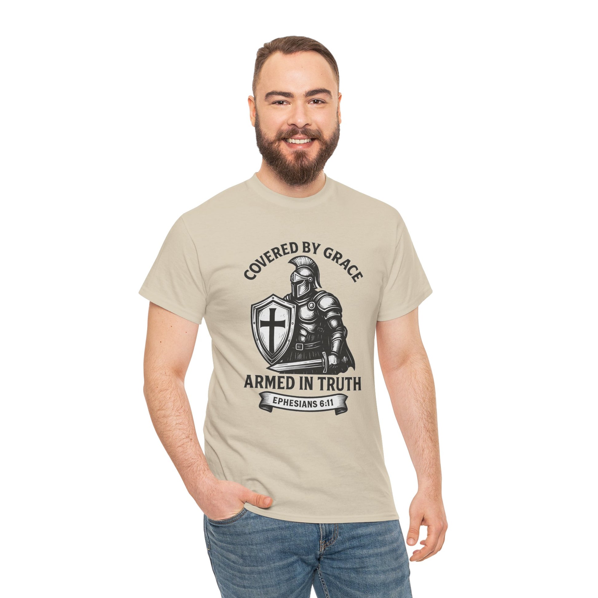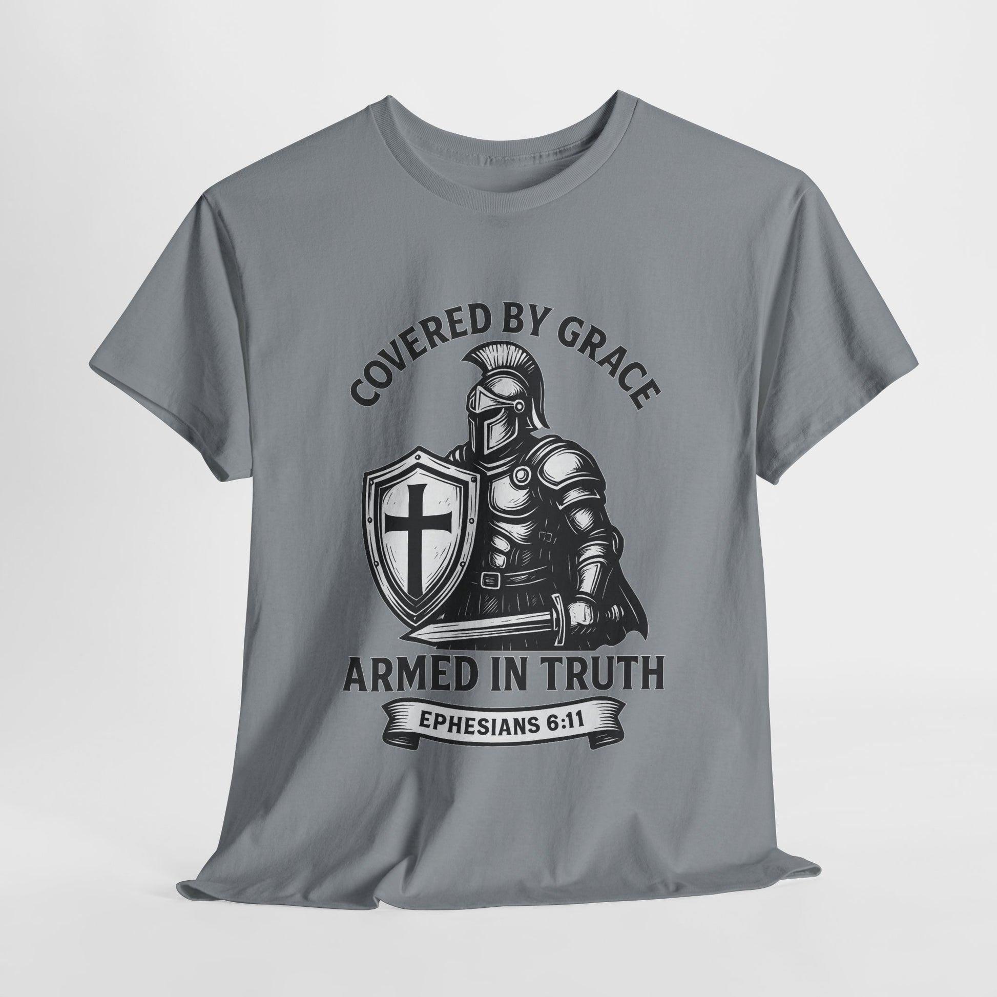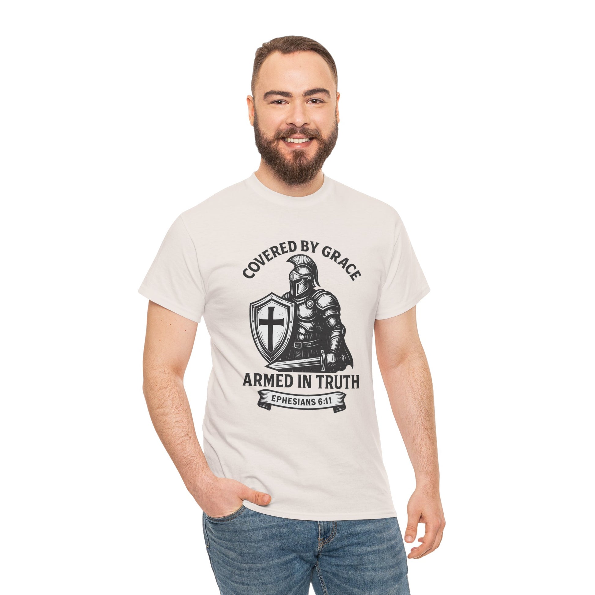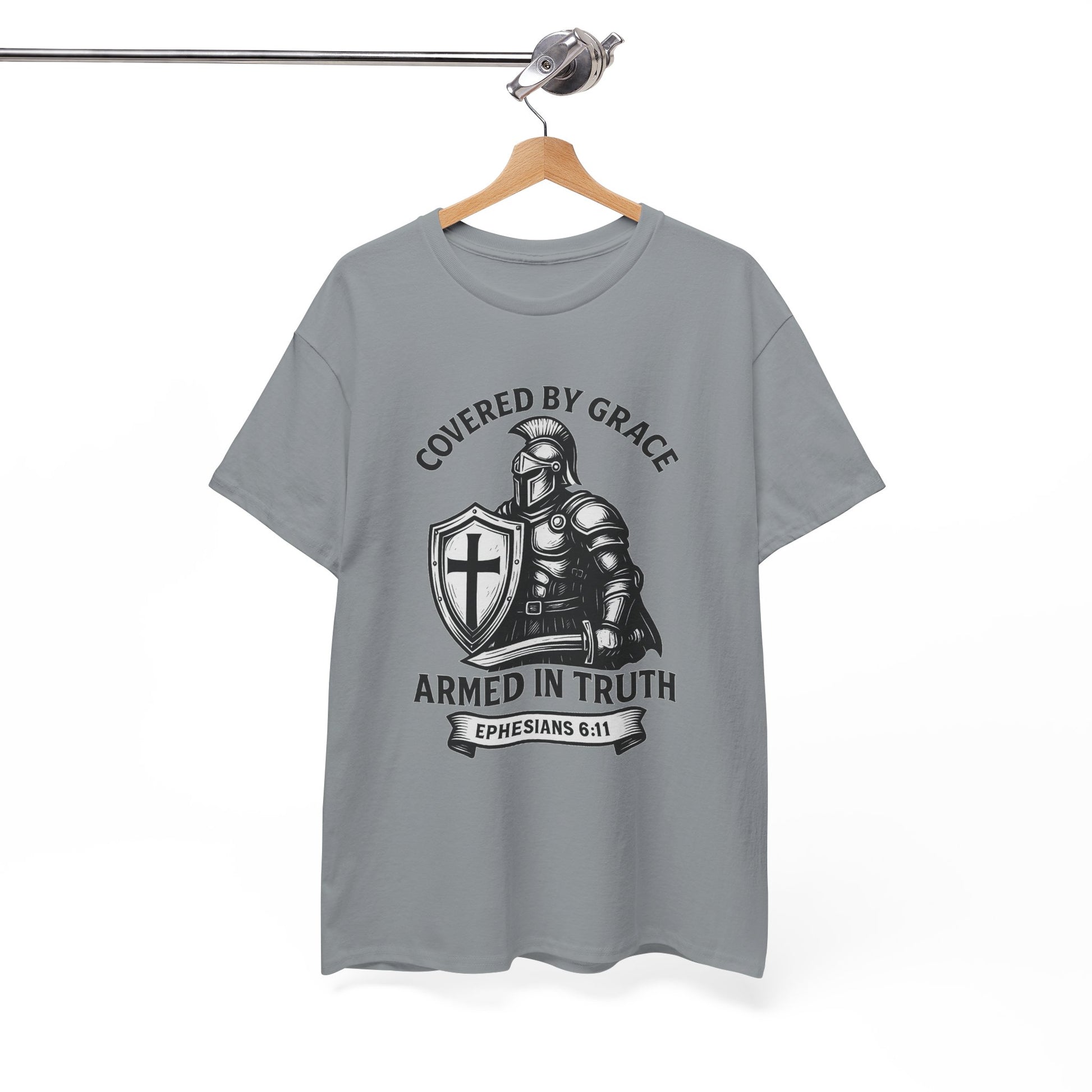 Stand firm in faith with our Covered by Grace Christian Tee — a bold, unisex shirt inspired by Ephesians 6:11. Featuring a powerful warrior design, this tee blends comfort, strength, and spiritual style. Perfect for believers who want to wear their faith proudly at church, gatherings, or everyday life.