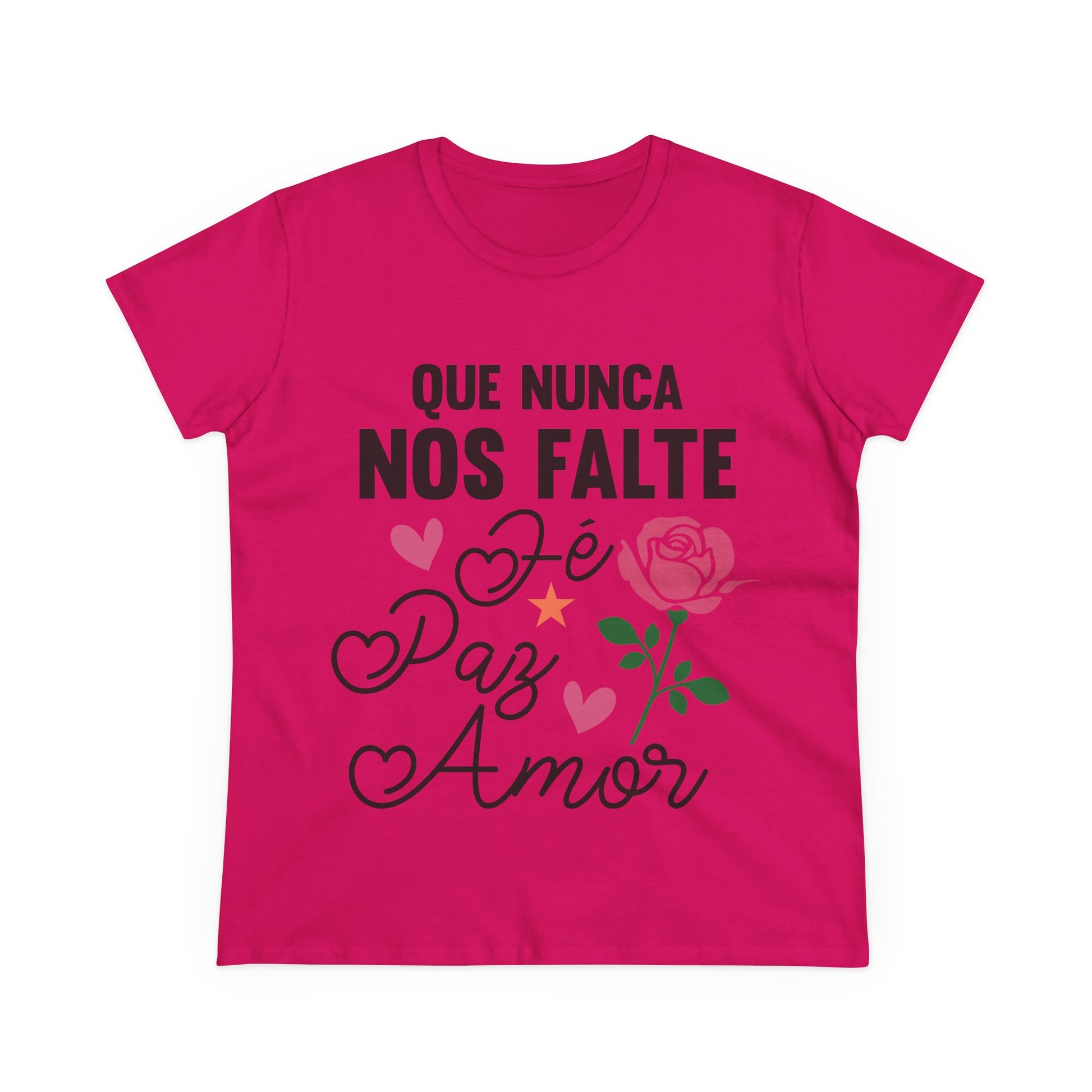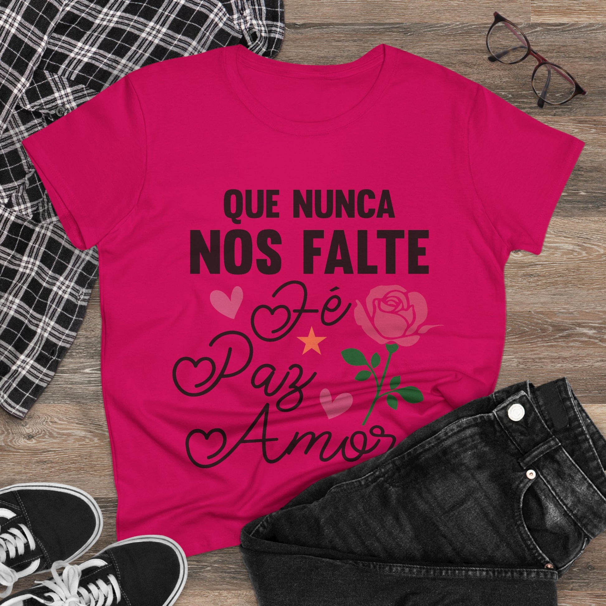 “Que Nunca Nos Falte Fe, Paz y Amor” - Camiseta de algodón para Mujer